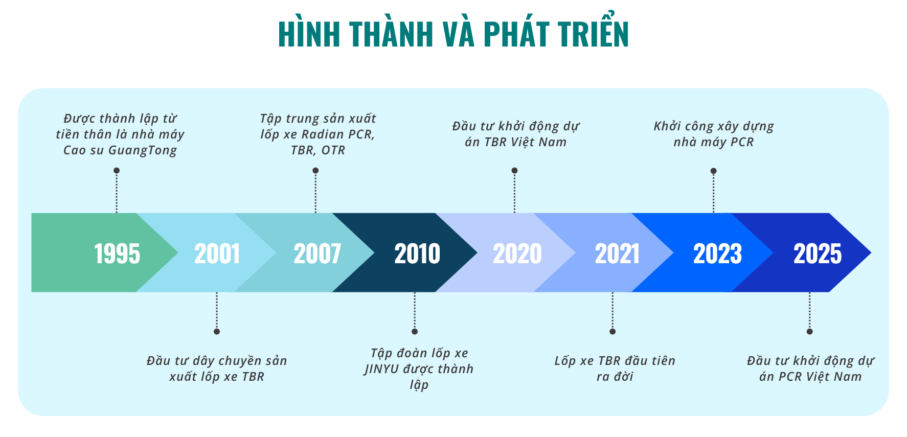 Công ty TNHH Jinyu (Việt Nam) Tire tự hào là đơn vị hàng đầu trong lĩnh vực lốp xe radial, với 30 năm xây dựng thương hiệu chất lượng trên thị trường ngành lốp xe. Jinyu (Việt Nam) Tire chuyên cung cấp các sản phẩm và dịch vụ chất lượng cao, mang đến cho khách hàng những trải nghiệm tốt nhất. Nhà máy sản xuất của chúng tôi có tổng diện tích 40 hecta, tọa lạc tại KCN Phước Đông, huyện Gò Dầu, tỉnh Tây Ninh. Với vị trí nhà máy thuận lợi, cách thành phố Hồ Chí Minh chỉ 1 giờ đồng hồ di chuyển. Tại Jinyu Tire, đội ngũ kỹ sư tài năng và dày dặn kinh nghiệm cùng các công nhân viên được đào tạo bài bản và chuyên nghiệp đã tạo nên một môi trường làm việc sáng tạo và không ngừng cải tiến. Chính điều đó đã đóng góp quan trọng vào sự thành công và phát triển bền vững của công ty.